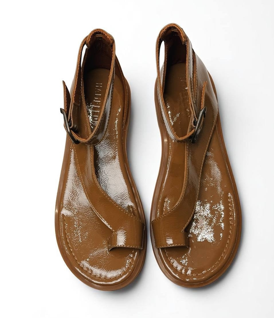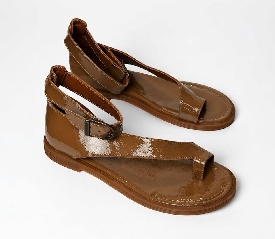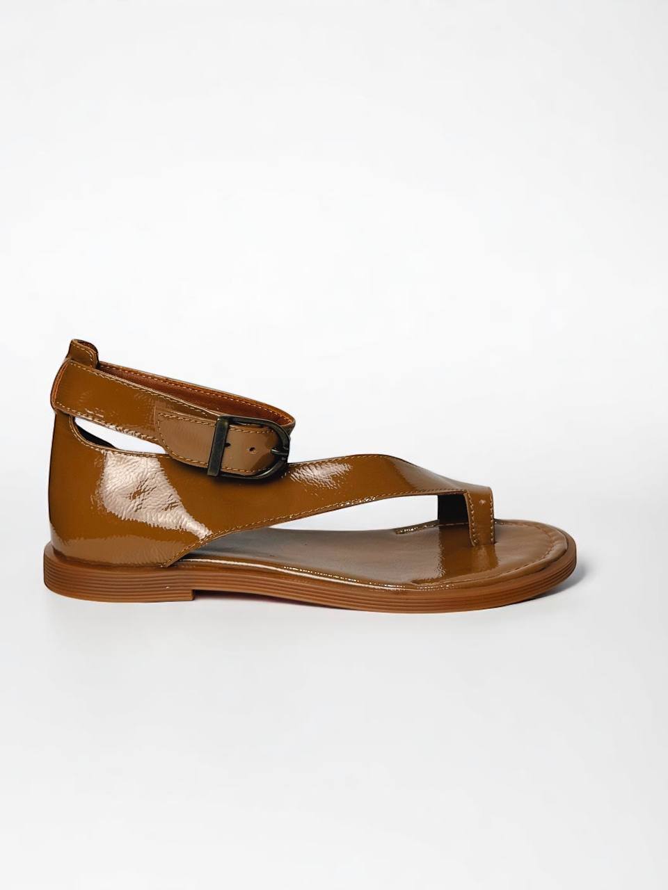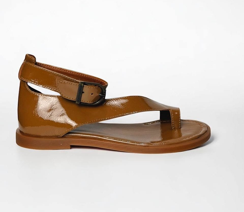 Sandals Tina Caramel on a low sole is made of Italian lacquer-leather.