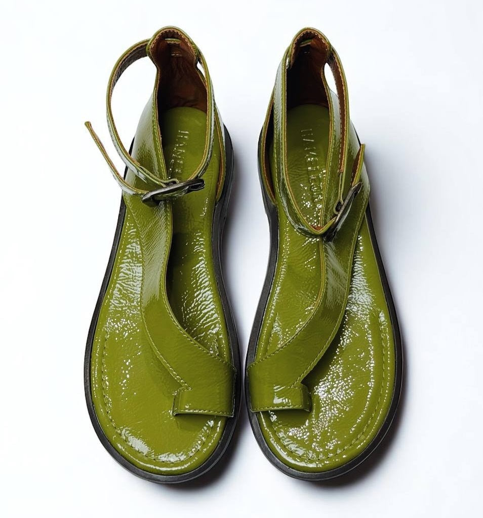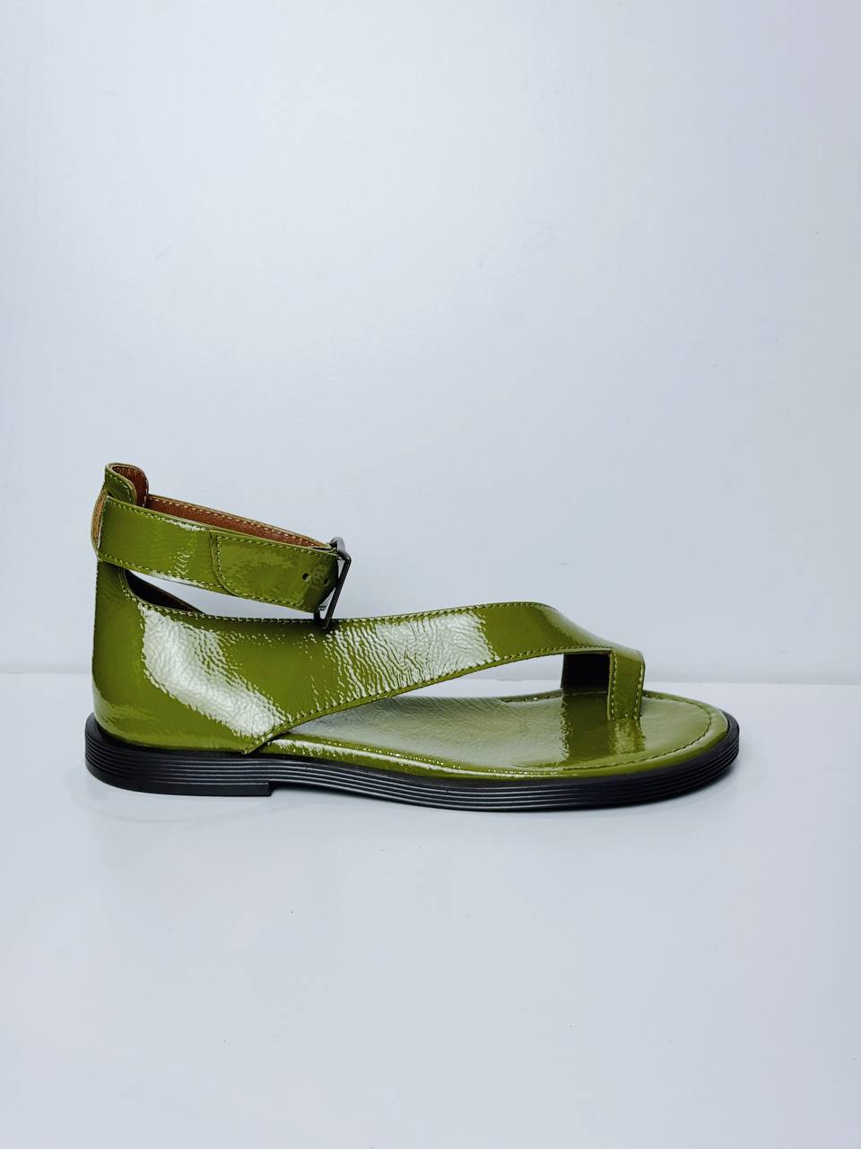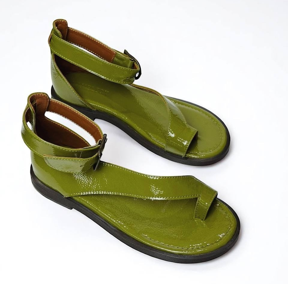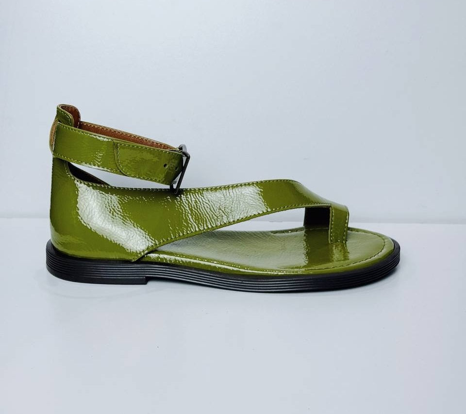 Sandals Tina Pistachio on a low sole is made of Italian lacquer-leather.